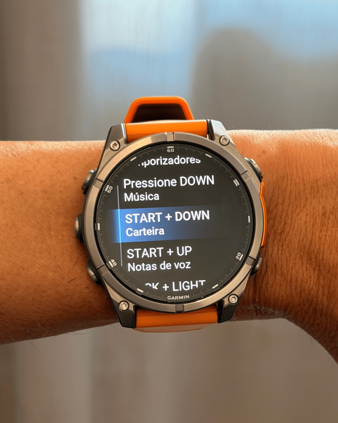 Siga esse passo a passo: acesse as configurações do relógio, pressionando e segurando o botão central esquerdo > Sistema > Atalhos > escolha o atalho desejado: eu escolhi acionar a carteira rapidamente ao pressionar e segurar START + DOWN.