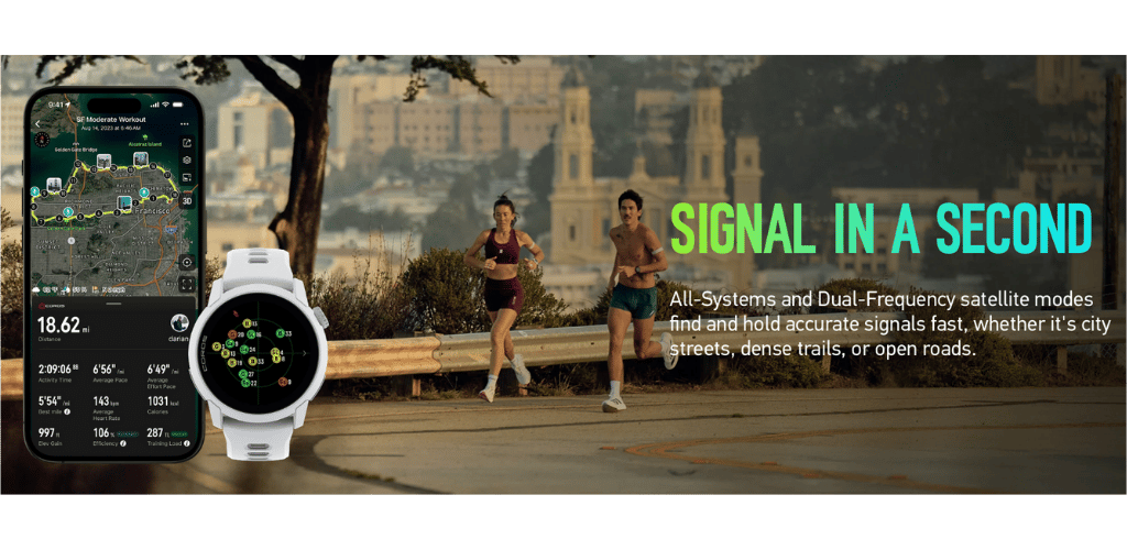 Já o Coros Pace 4 vem com GPS dual-band (L1+L5), a mesma tecnologia encontrada em relógios muito mais caros. A vantagem do GPS dual-band do Coros aparece em situações específicas: