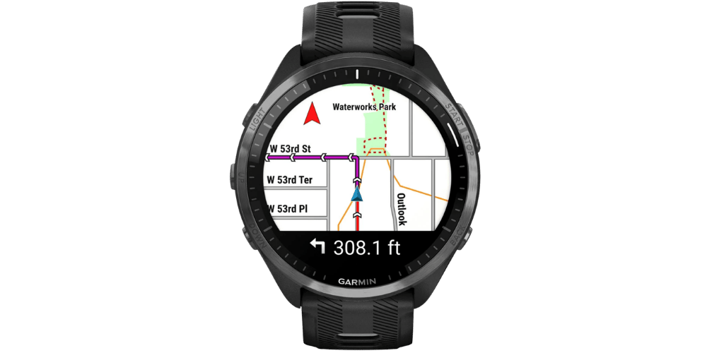O 965 tem mapas offline completos. Você sai para correr ou pedalar em qualquer lugar, o relógio mostra o traçado ao redor, seu caminho percorrido e te traz de volta para o ponto de partida se você precisar, com um guia de curva a curva. Isso facilita demais.
