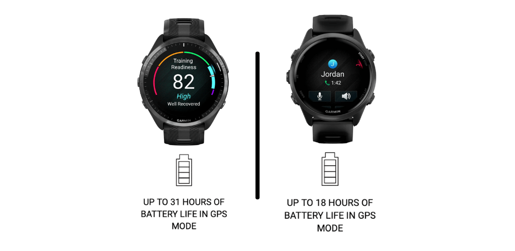 No modo GPS com multi-banda, o 570 entrega até 18 horas (47mm). O 965 chega a até 31 horas. São treze horas a mais de atividade com GPS rodando.