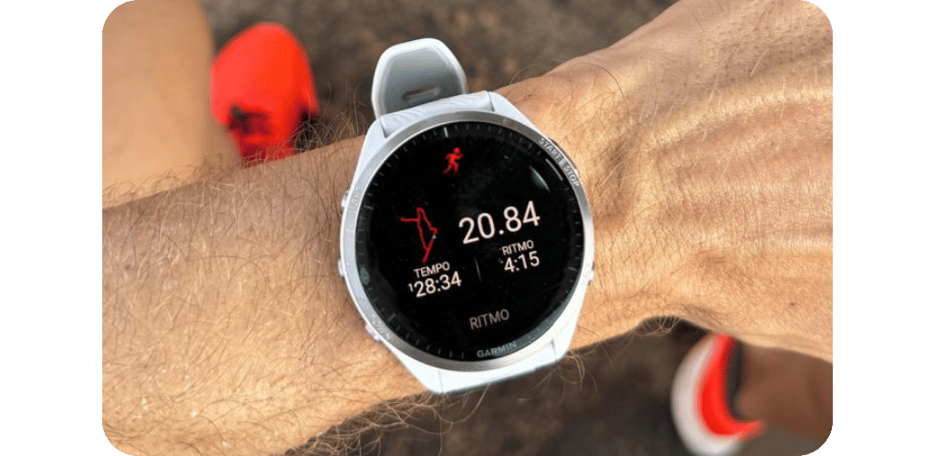 Tamanho e uso diário. 47,2mm e 53 gramas. Um relógio que fica bem no pulso durante uma prova de Ironman, uma corrida de madrugada ou um dia inteiro de trabalho. Não é grande demais, não é pequeno demais. É exatamente o que precisa ser.