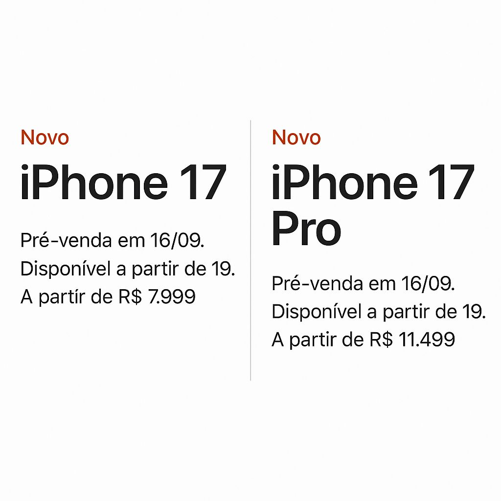 O iPhone 17 custa R$ 7.999, enquanto o iPhone 17 Pro custa R$ 11.499. Esses valores são os comercializados pela Apple Brasil. Você tem 10% de desconto se pagar no Pix e também pode conseguir valores mais em conta em grandes varejistas, como, por exemplo, Amazon, Mercado Livre, Casas Bahia, Americanas e até em operadoras telefônicas.