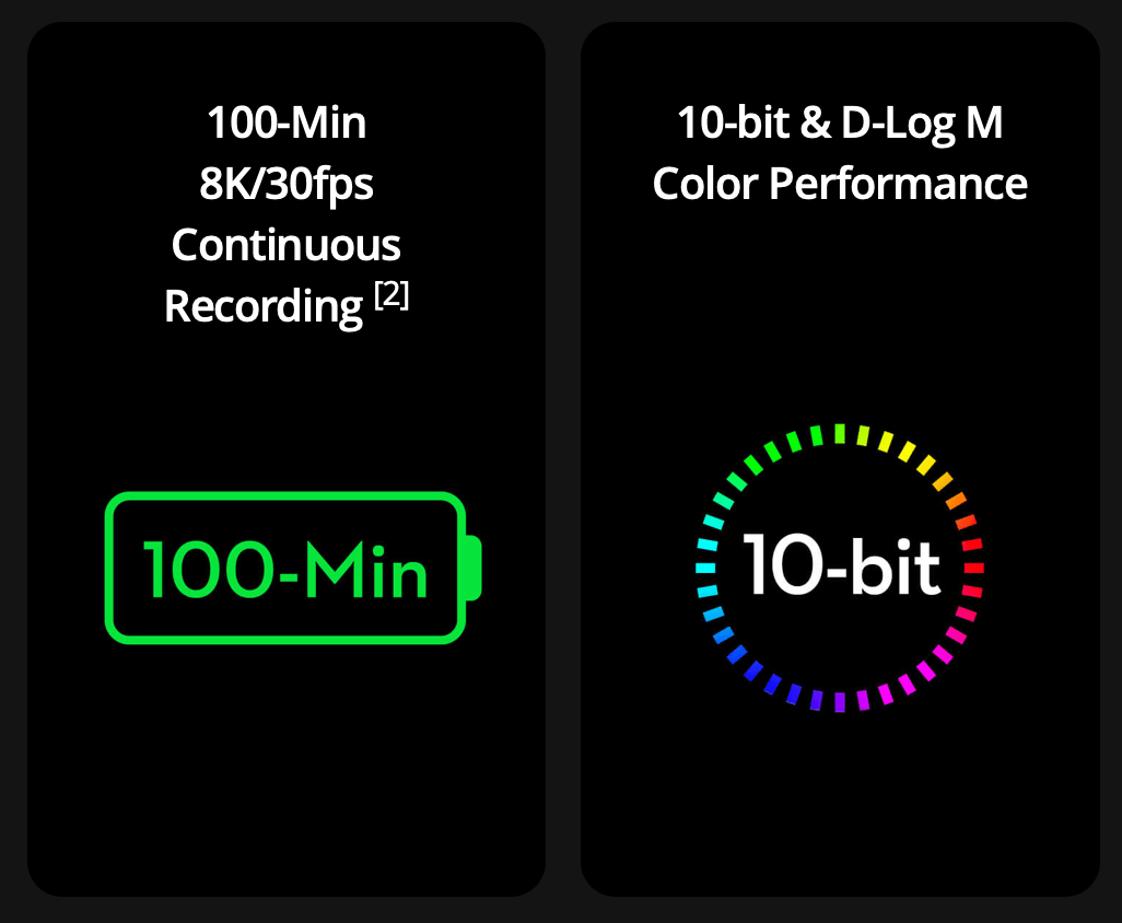 A Osmo 360 oferece desempenho de cor de nível profissional (assim como a MAX2), com 10-bit & D-Log M Color Performance, permitindo maior flexibilidade na pós-produção. Sua bateria tem excelente autonomia, suportando 100 minutos de gravação contínua em 8K 30fps (a GoPro não informou no site a autonomia da bateria).