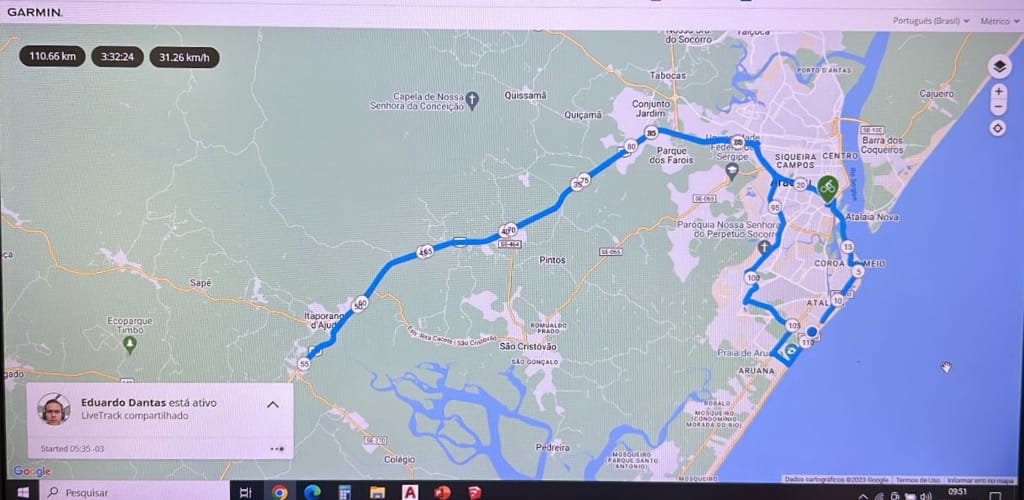 Você inicia uma atividade com GPS no relógio e o Garmin Connect envia automaticamente um link para os contatos cadastrados. Eles clicam e veem sua localização atual, por onde passou e trajeto, tudo atualizado em tempo real.