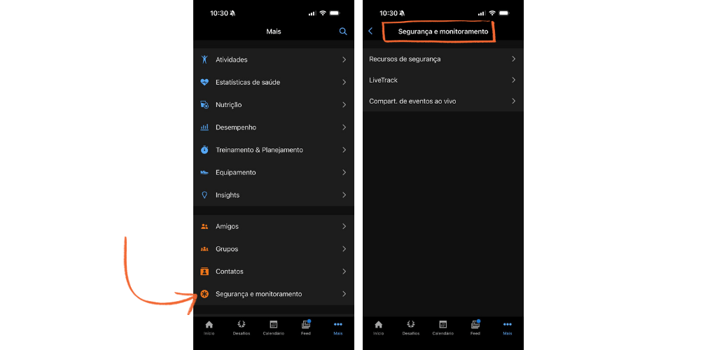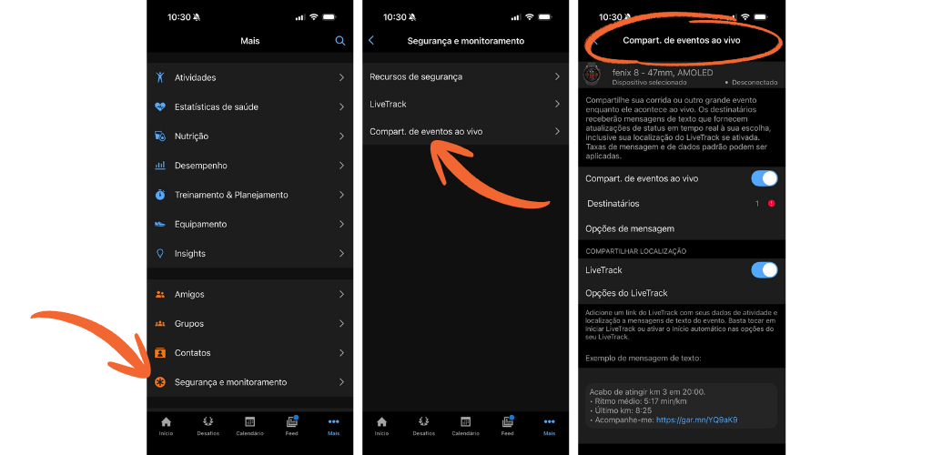 Como ativar: no app Garmin Connect, vá em Mais > Segurança e monitoramento > Compartilhamento de eventos ao vivo > ative a opção Compart. de eventos ao vivo > Defina os Destinatários e salve.